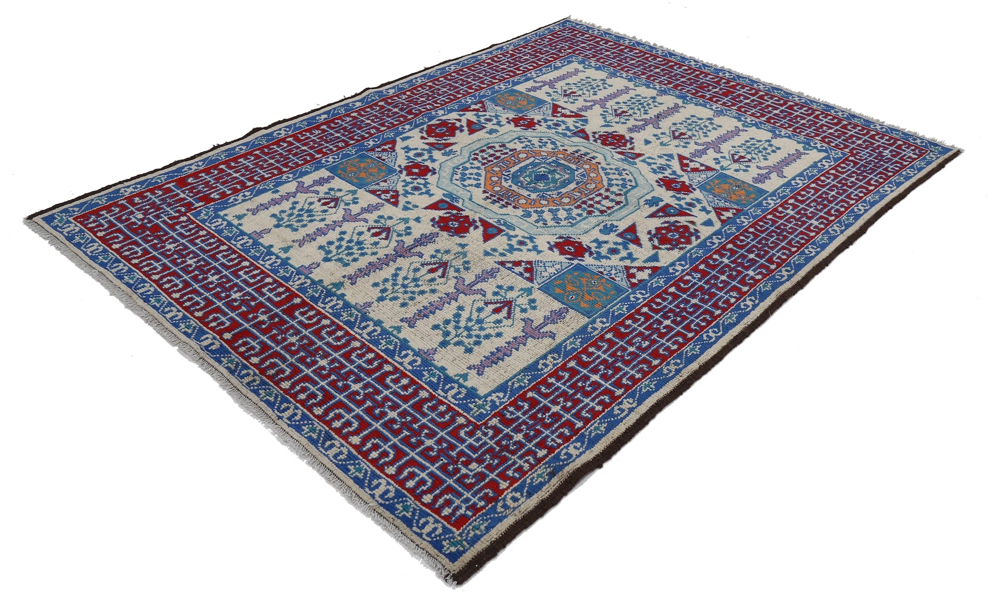 The hand-knotted Afghan wool rug features an intricate tribal geometric design, celebrated for its cultural heritage and timeless elegance. Woven by skilled artisans, it offers exceptional durability, making it ideal for high-traffic areas. Its unique patterns and premium wool blend tradition with modern sophistication, adding warmth and character to any interior.