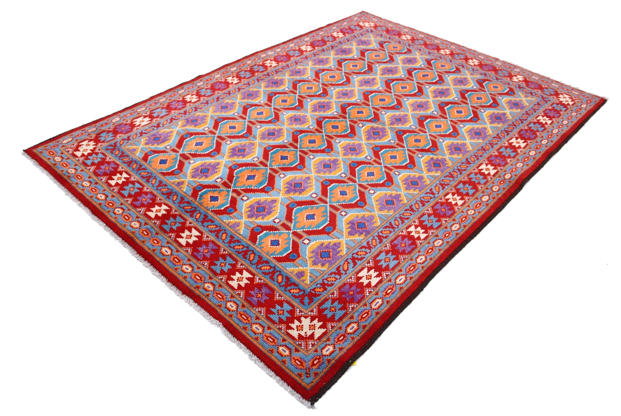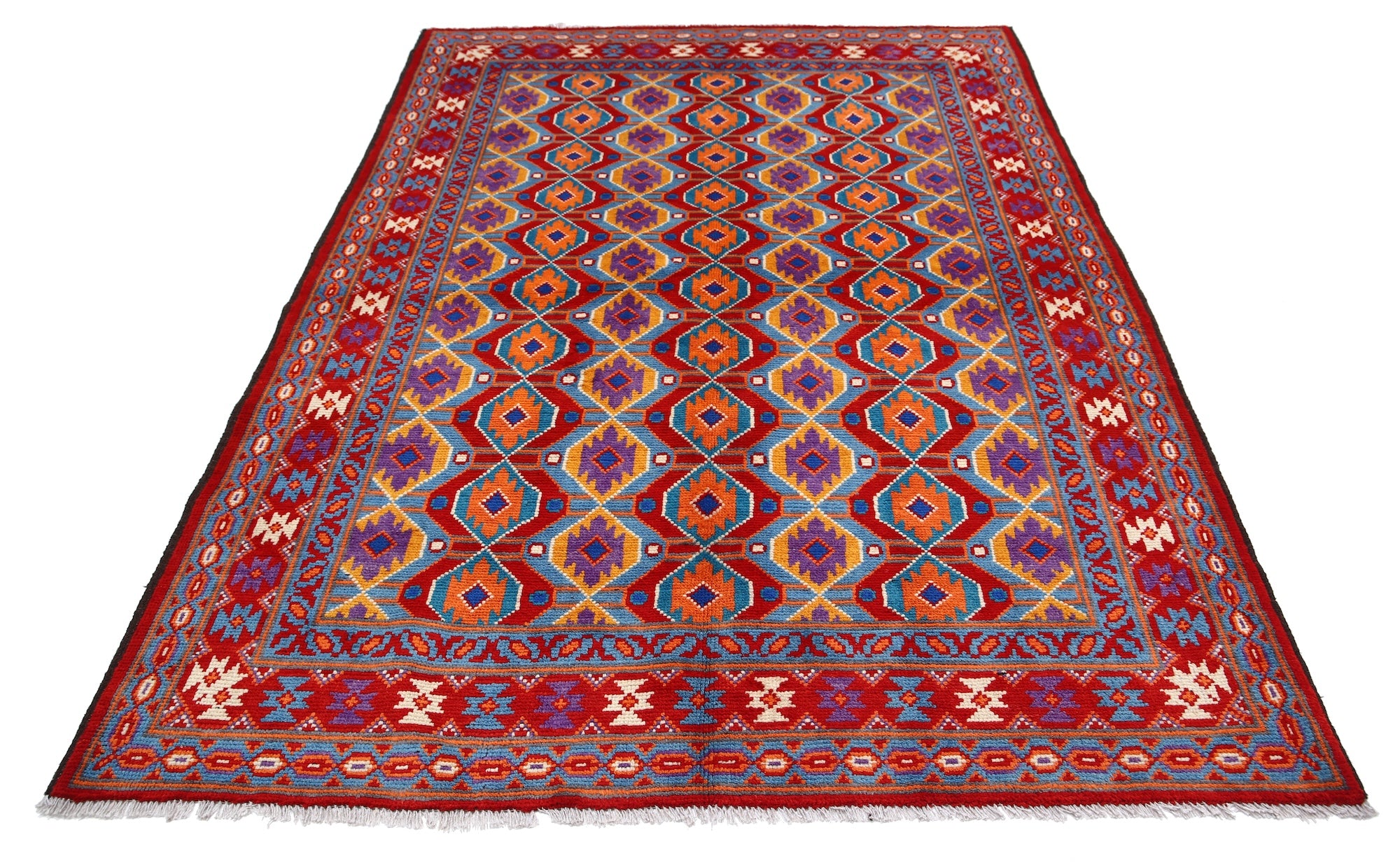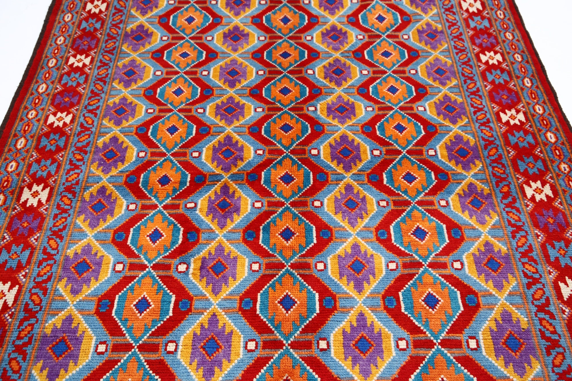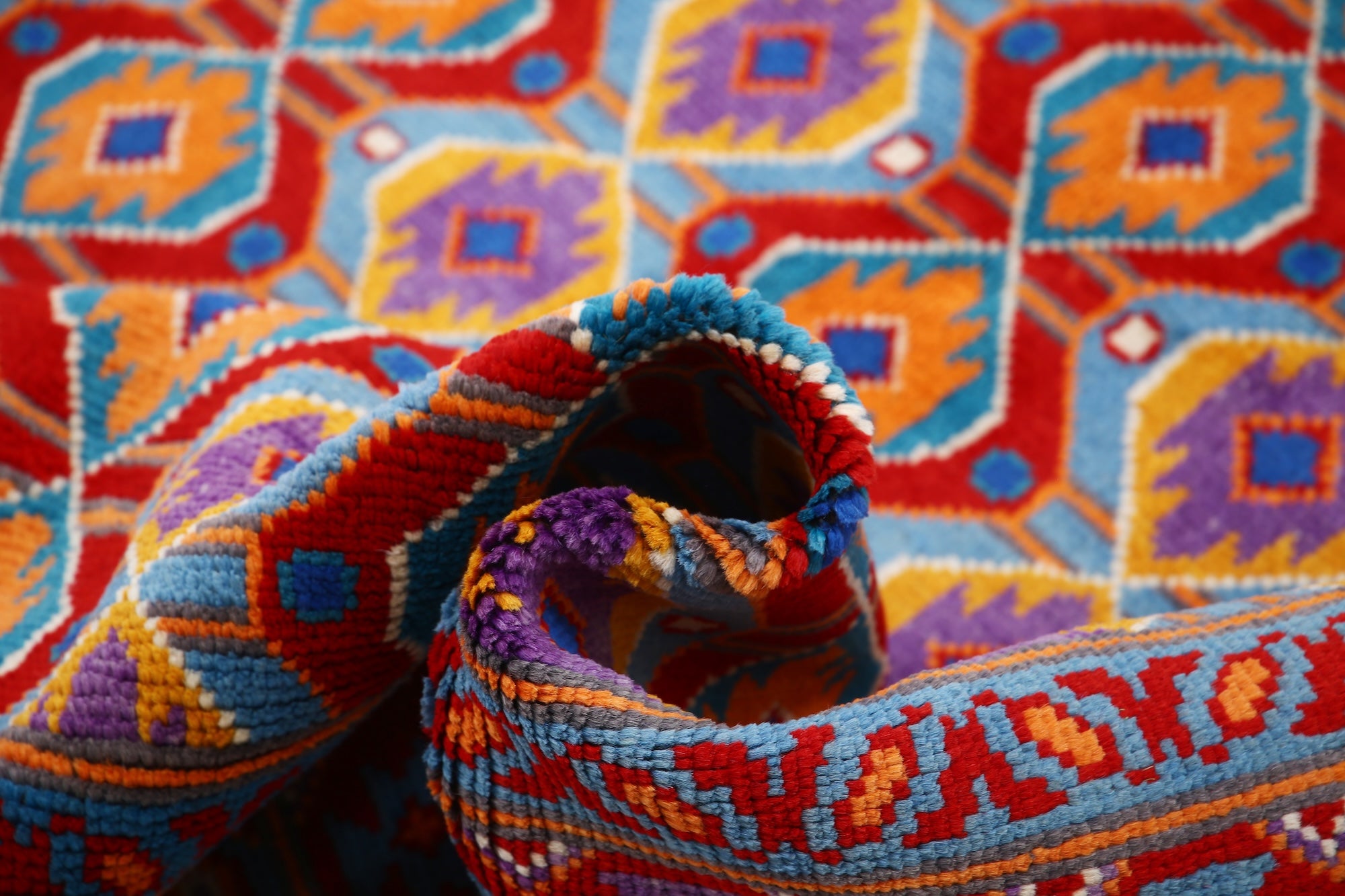 The hand-knotted Afghan wool rug features an intricate tribal geometric design, celebrated for its cultural heritage and timeless elegance. Woven by skilled artisans, it offers exceptional durability, making it ideal for high-traffic areas. Its unique patterns and premium wool blend tradition with modern sophistication, adding warmth and character to any interior.