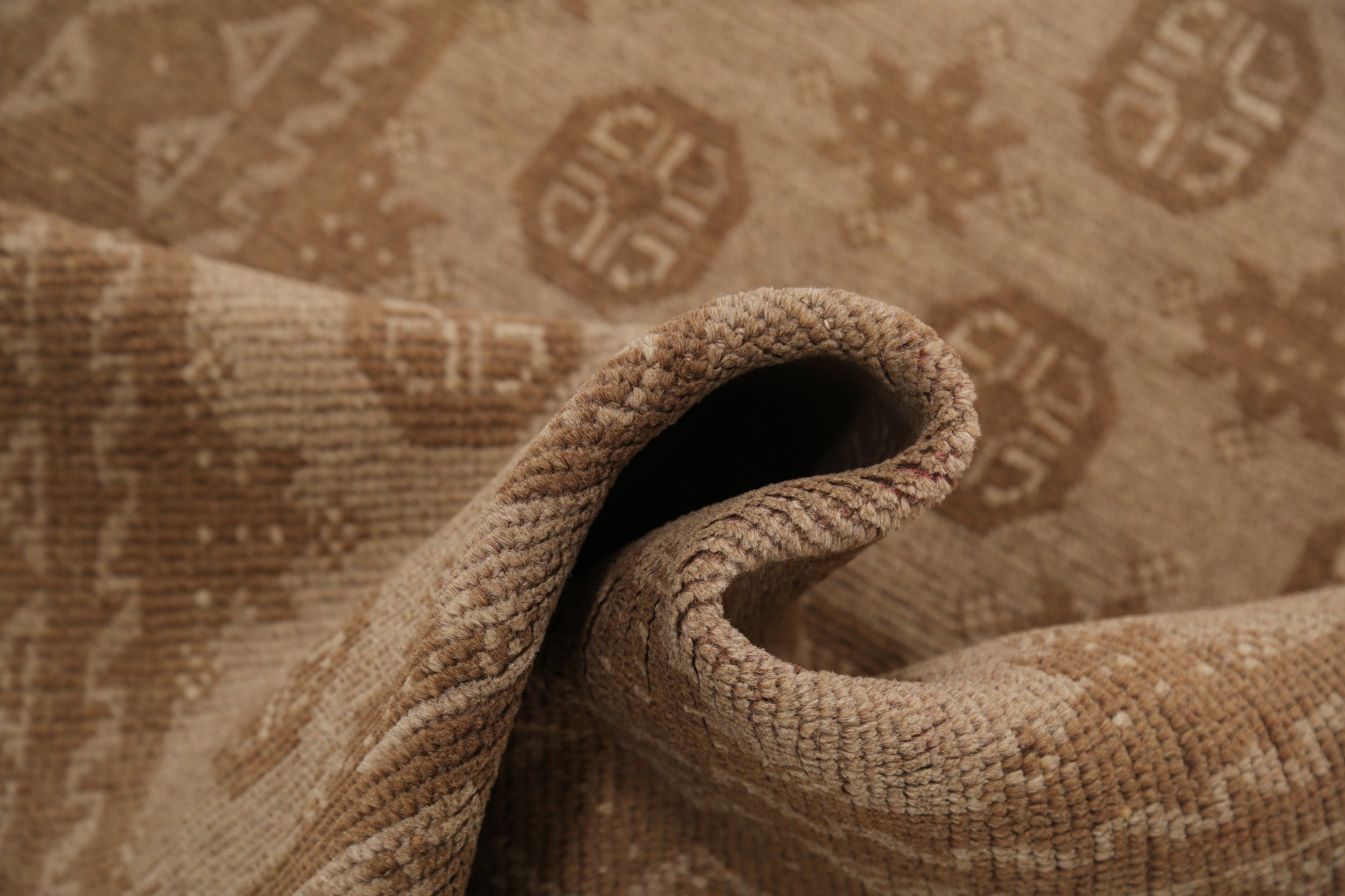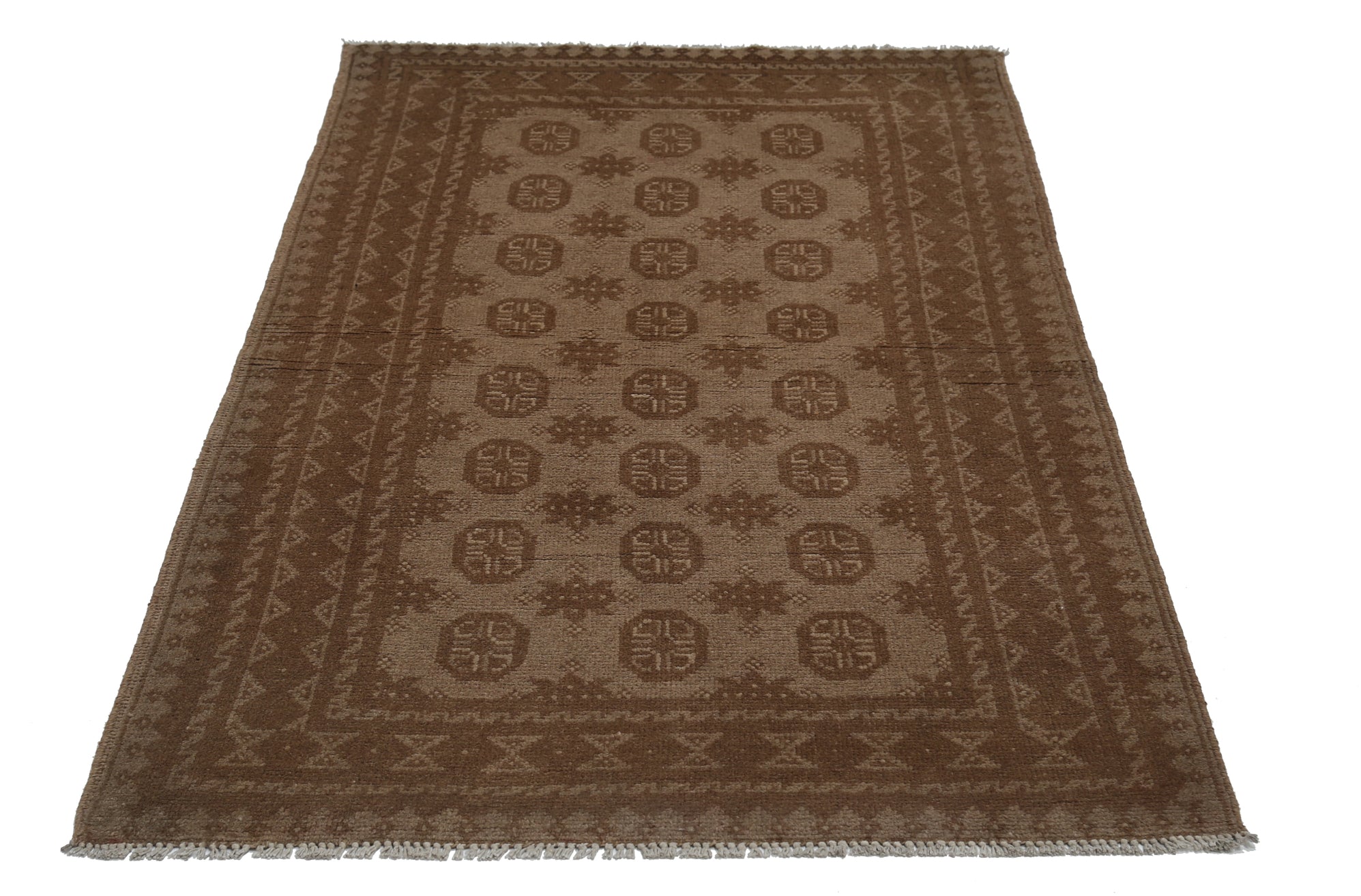 This hand-knotted Afghan wool rug features a striking tribal geometric pattern inspired by traditional designs. Rugs of this type are known for their rich, earthy tones, featuring shades of red, blue, green, gold, and yellow, adding warmth and character to any space. Crafted with a loose weave knotting technique similar to the Oushak style, it blends timeless appeal with authentic craftsmanship.