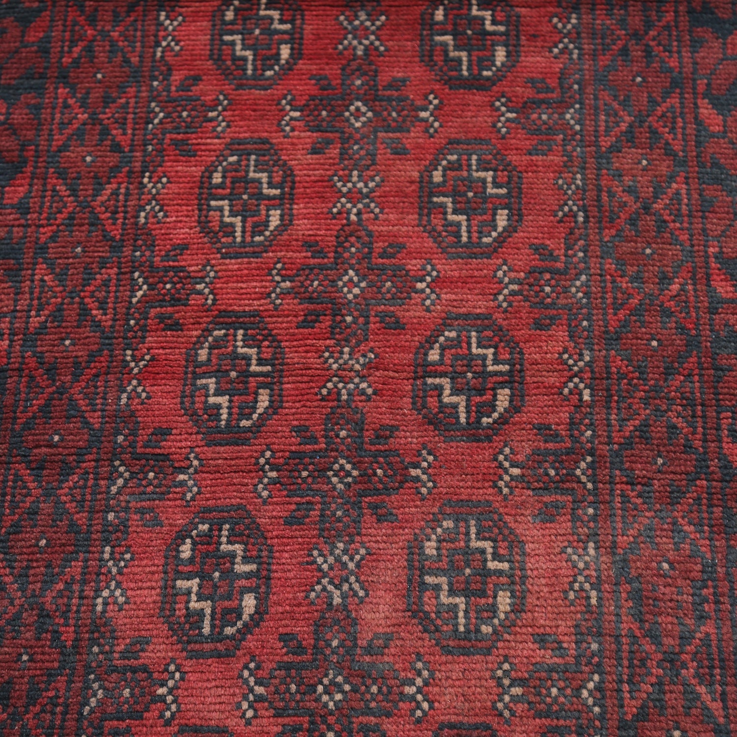 This hand-knotted Afghan wool rug features a striking tribal geometric pattern inspired by traditional designs. Rugs of this type are known for their rich, earthy tones, featuring shades of red, blue, green, gold, and yellow, adding warmth and character to any space. Crafted with a loose weave knotting technique similar to the Oushak style, it blends timeless appeal with authentic craftsmanship.