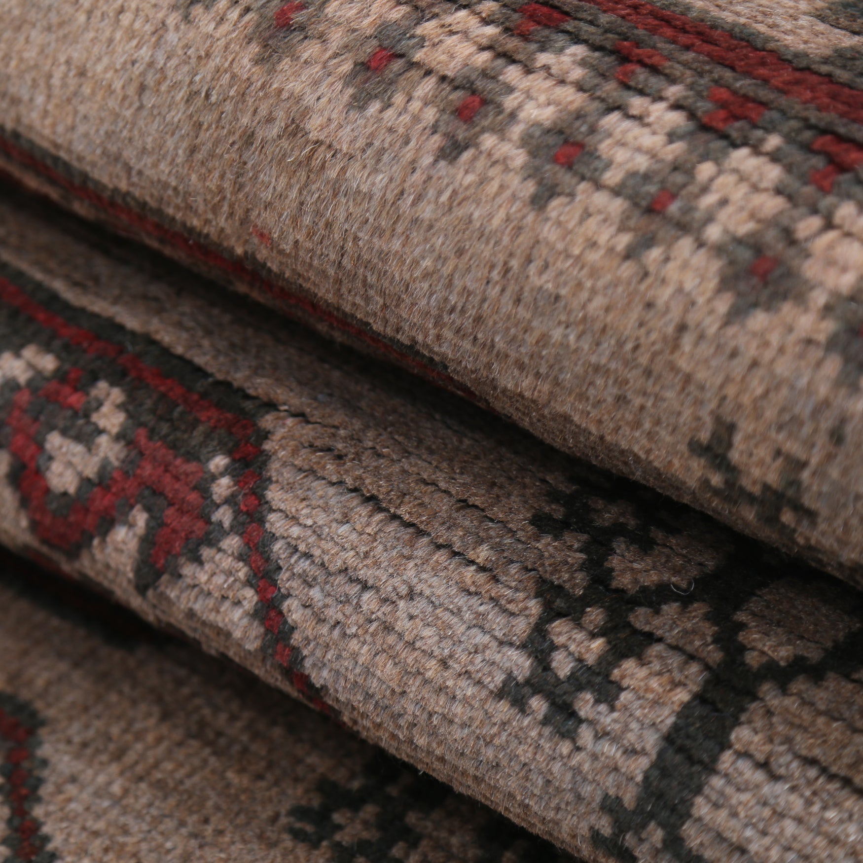 This hand-knotted Afghan wool rug features a striking tribal geometric pattern inspired by traditional designs. Rugs of this type are known for their rich, earthy tones, featuring shades of red, blue, green, gold, and yellow, adding warmth and character to any space. Crafted with a loose weave knotting technique similar to the Oushak style, it blends timeless appeal with authentic craftsmanship.