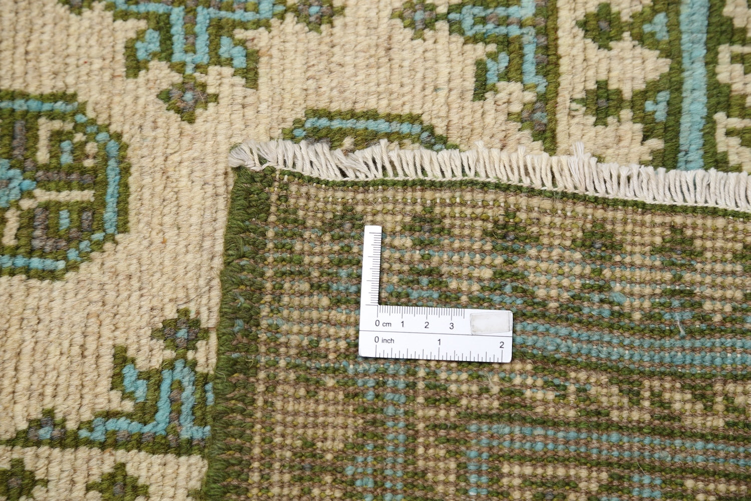 This hand-knotted Afghan wool rug features a striking tribal geometric pattern inspired by traditional designs. Rugs of this type are known for their rich, earthy tones, featuring shades of red, blue, green, gold, and yellow, adding warmth and character to any space. Crafted with a loose weave knotting technique similar to the Oushak style, it blends timeless appeal with authentic craftsmanship.